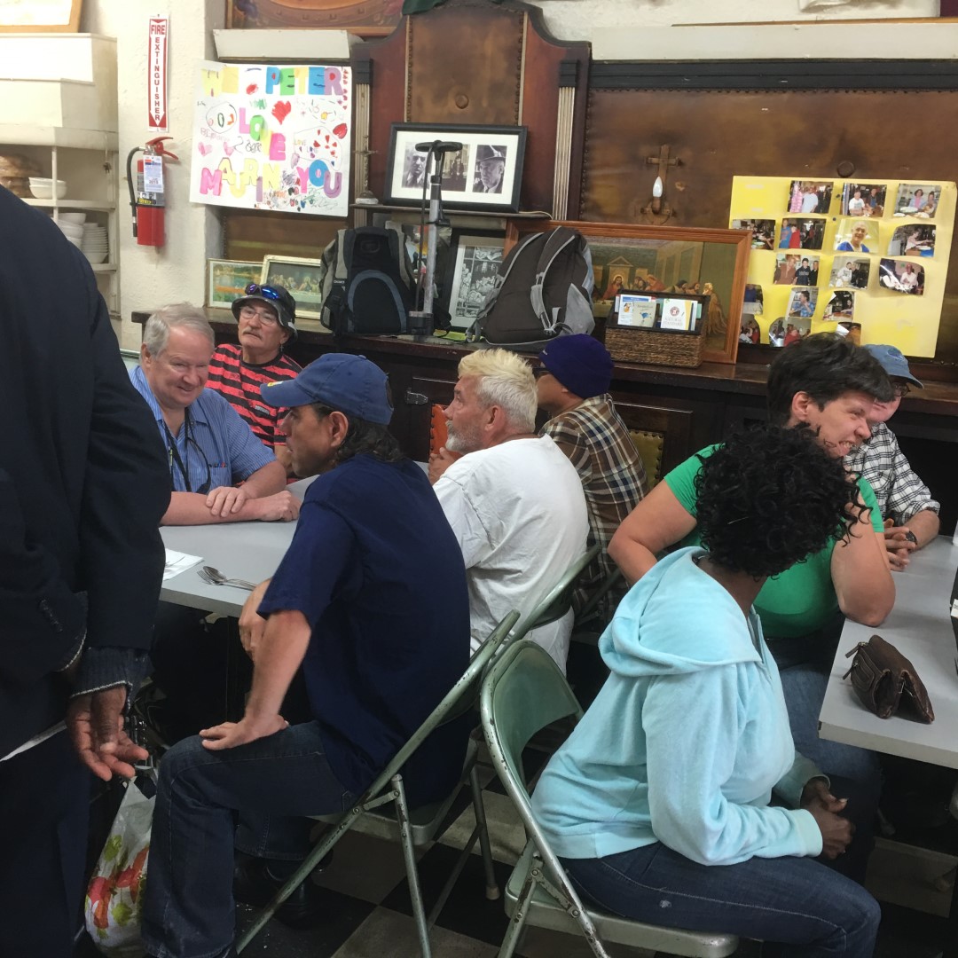 I have been privileged to volunteer at the Peter Maurin Center for the last 8 to 10 years, generally to prepare and serve lunch on Fridays. I act as a stock boy, sous chef, a cook in training, the guy who opens forty cans for beans, potato peeler extraordinaire, a greeter of guests, a server, a dishwasher. I sweep floors and wash tables. After serving dinner and while cleaning up I and others set aside food for the Saturday's Matthew 8:20 group of volunteers.